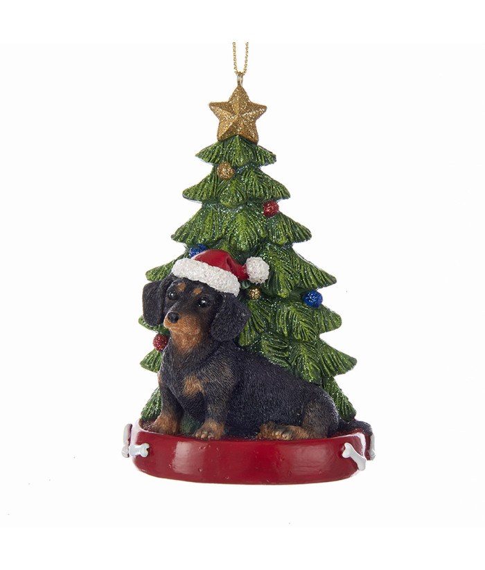 Ornement de Teckel noir avec sapin. Personnalisable. Fait en résine.