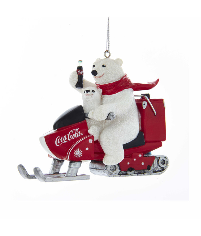 Ornement, papa ours polaire et ourson sur skidoo Coca Cola