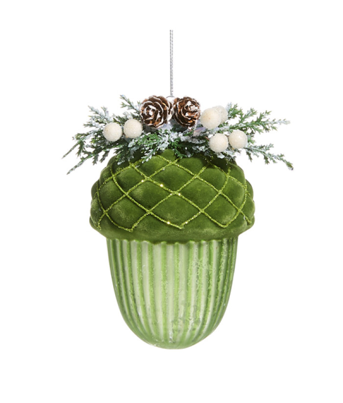 Ornement, gland vert avec des baies de gui et des pommes de pin. Mesure 5".