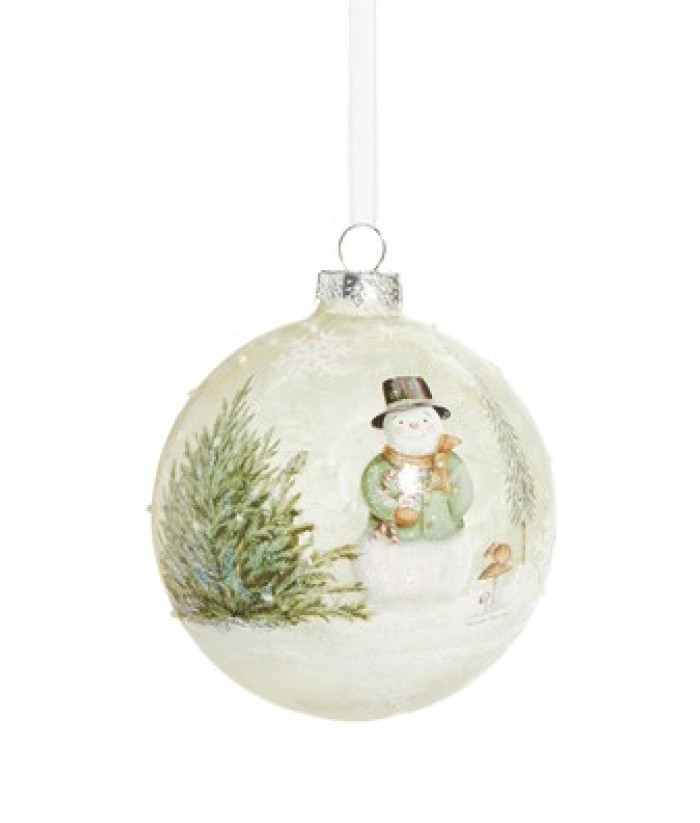 Ornement en verre, scène d'hiver avec bonhomme de neige en manteau vert, mesure 4"