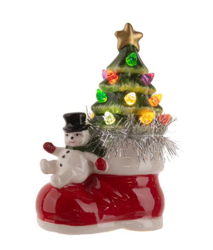 Pièce de table, bonhomme de neige avec une grande botte rouge et arbre de Noël, éclairage LED