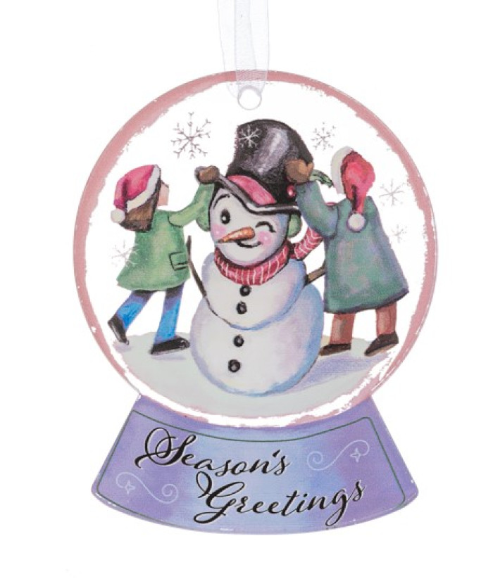 Ornement, boule à neige avec des enfants faisant un bonhomme de neige et un message de Noël