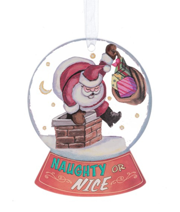 Ornement, boule à neige avec le Père Noël descendant d’une cheminée