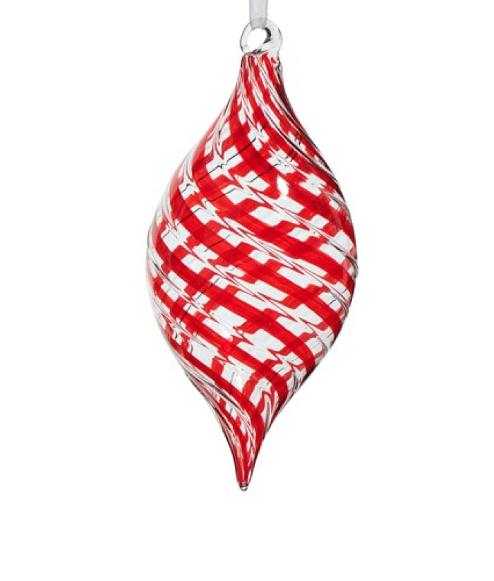 Ornement en verre, tourbillon de menthe poivrée, en forme de finial, mesurant 10 centimètres.