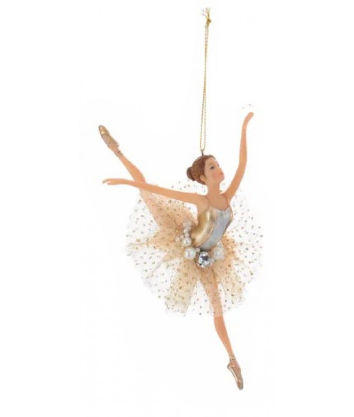 Ornement de ballerine avec robe dorée. Fait en résine.