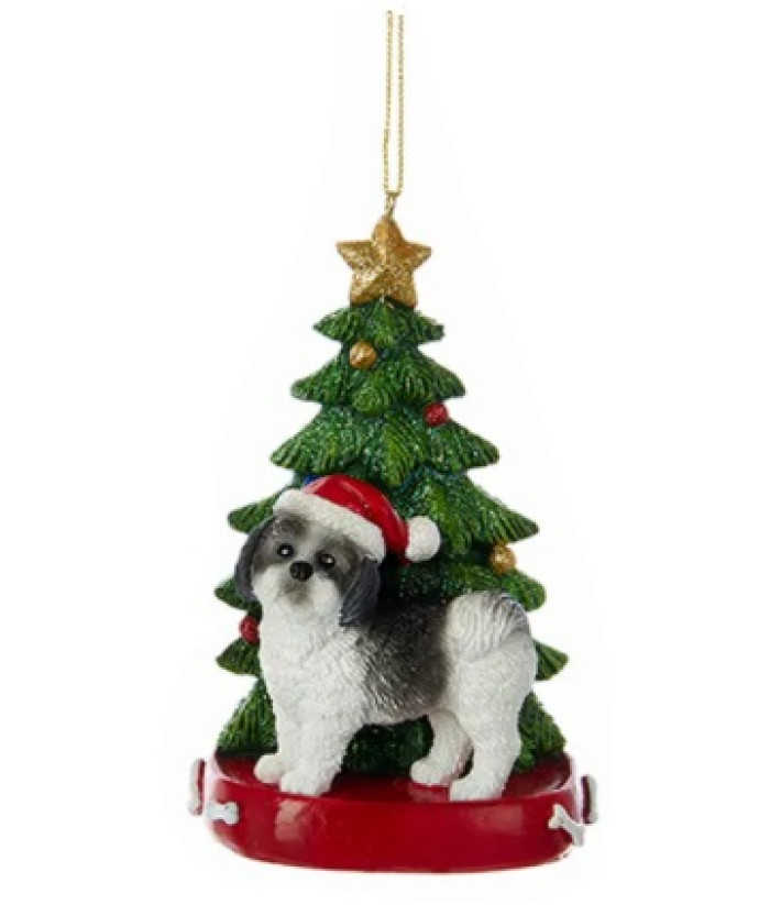 Ornement de Shih-Tzu noir avec sapin. Personnalisable. Fait en résine.