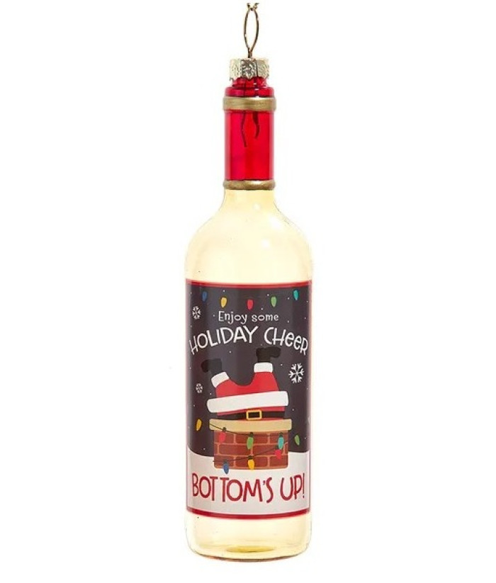 Ornement en verre, Une bouteille de vin blanc, avec le motif "Enjoy some holiday Cheer"