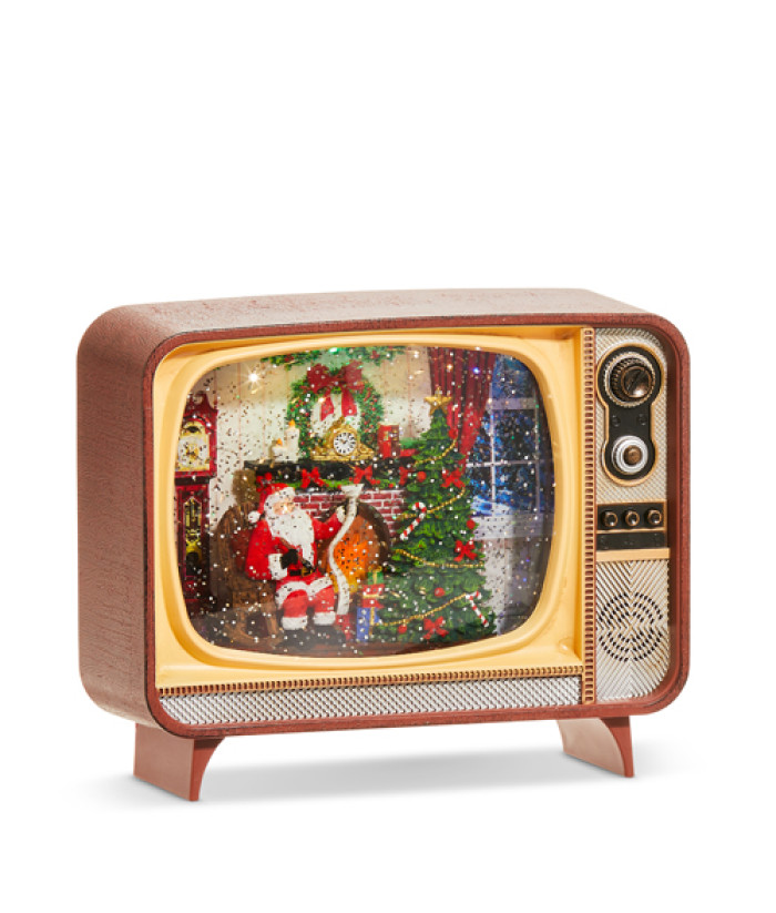 Décoration de table, Père Noël près de la cheminée, lanterne musicale à eau/TV, nécessite 3 piles de taille C (comprend un cordon USB mais pas l'adaptateur secteur USB)