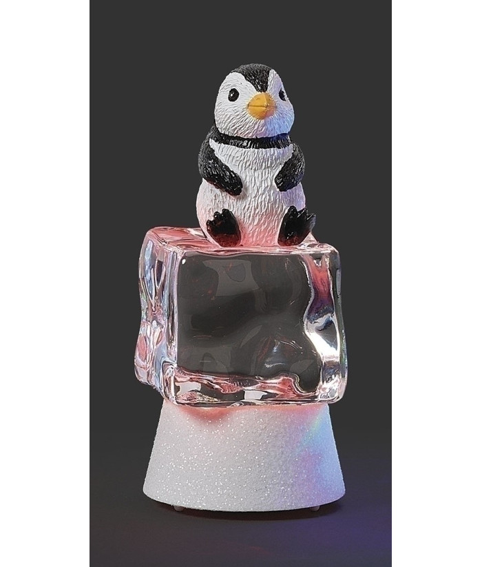 Pièce de table, pingouin illuminé par une lumière scintillante sur un cube de glace rouge