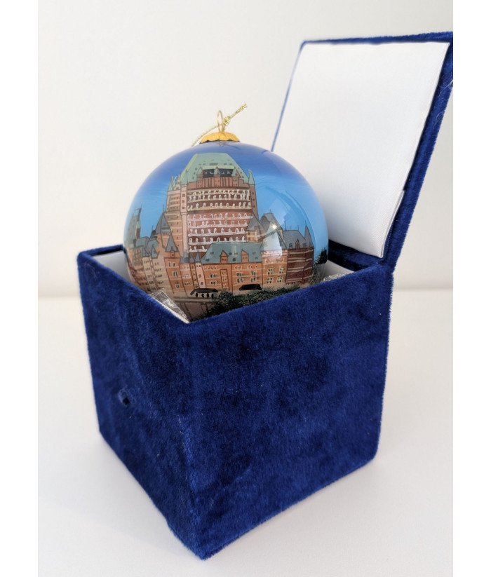 Souvenir de la ville de Québec, ornement en verre du Château Frontenac. Fait en verre. Conçu et produit exclusivement pour La Boutique de Noël.