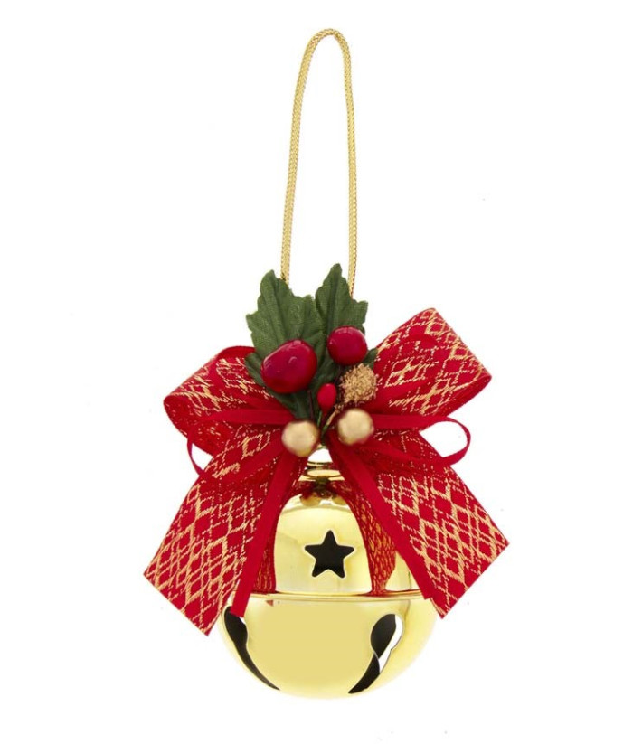Présente une cloche en or avec des découpes en forme d'étoiles, un nœud en ruban rouge et or ainsi que des feuilles vertes et des baies rouges