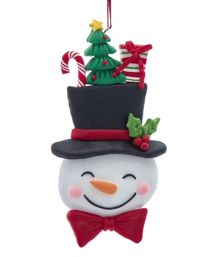 Ornement, tête de bonhomme de neige portant un chapeau décoré de manière festive