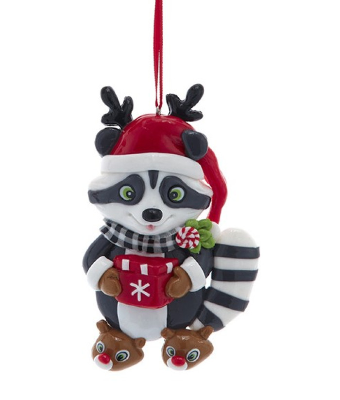 Ornement, un raton laveur mignon avec une boîte cadeau rouge