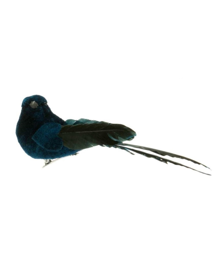 Oiseau des bois bleu profond, ornement à clip. L'article mesure 18 cm.