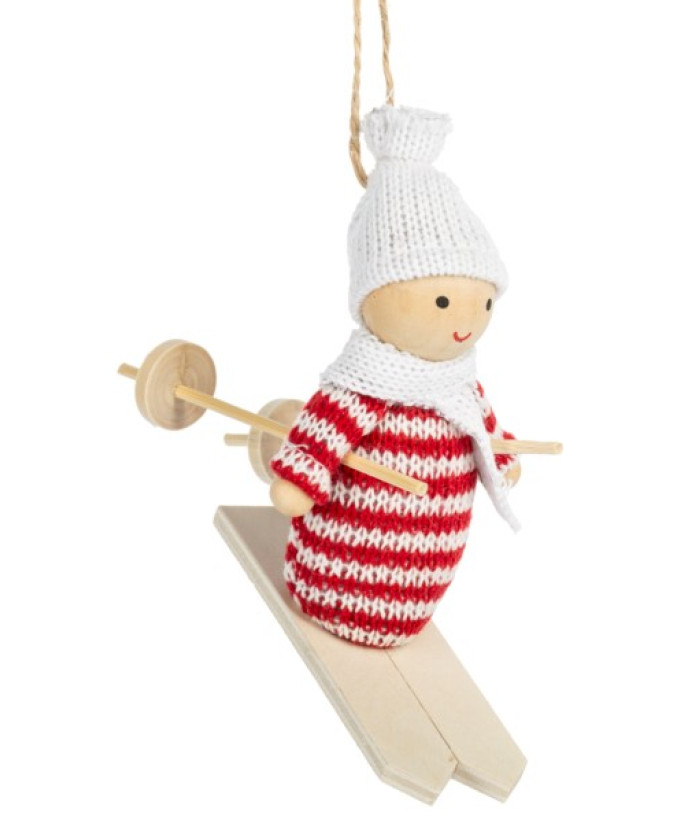 Ornement en bois, petit skieur rond en rouge,