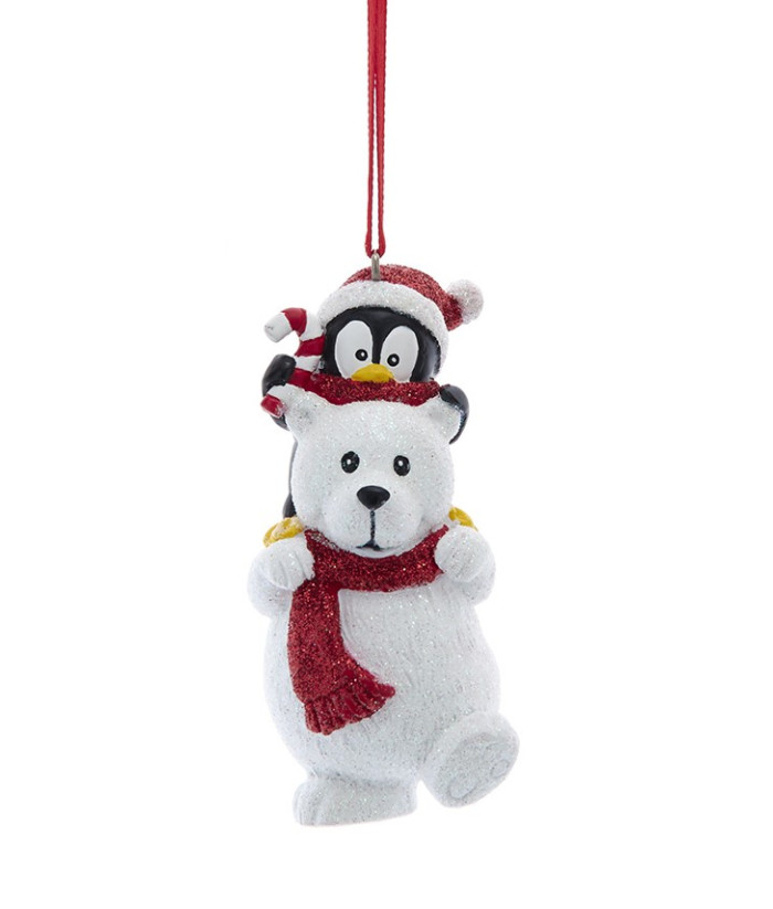 Ornement, un ours polaire portant M. Pingouin sur le dos.