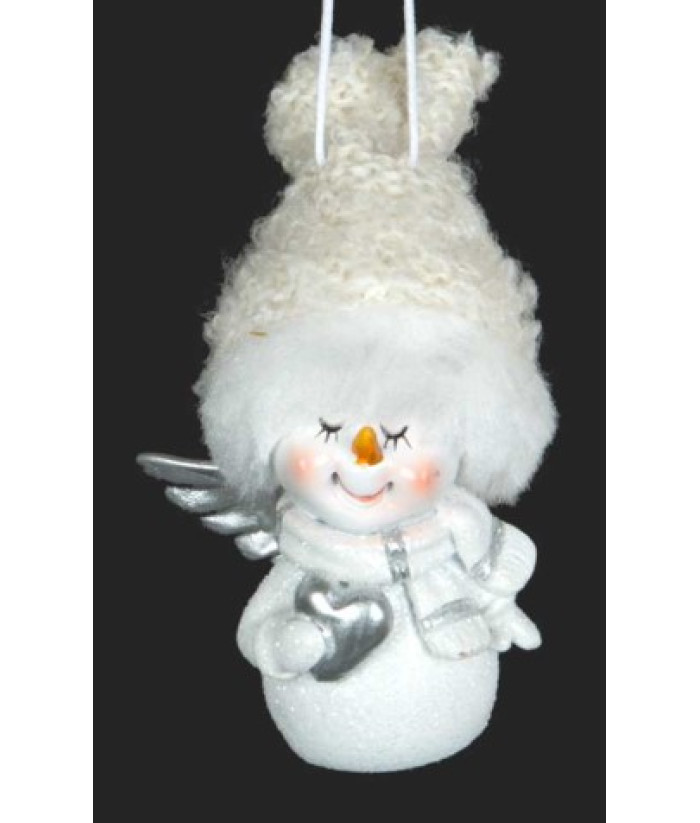 Ornement bonhomme de neige, avec un chapeau blanc et duveteux.