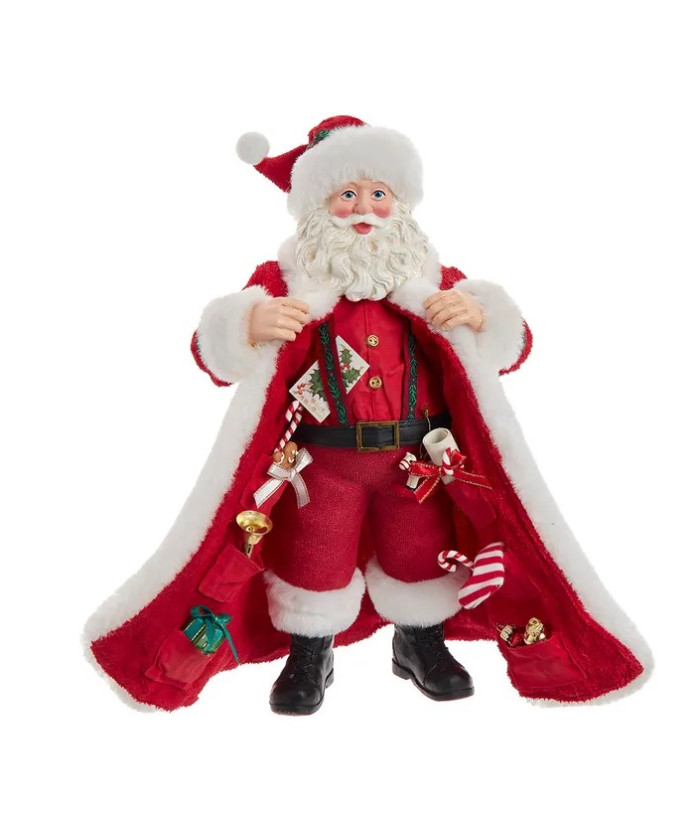 Apportez une touche fantaisiste à votre décoration de vacances avec un Père Noël Fabriché™ de 10,5" avec des cadeaux dans ses poches. Cette charmante figurine du Père Noël, fabriquée avec le souci du détail de Fabriché™, présente un joyeux Père Noël vêtu d'un traditionnel costume rouge, avec des cadeaux soigneusement rangés dans ses poches.